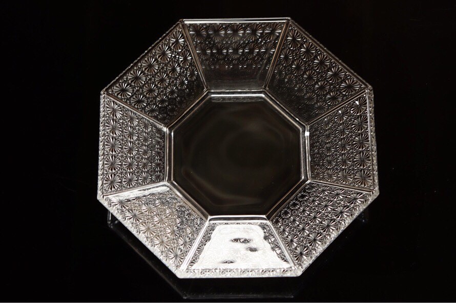 江戸切子の伝統的な模様である菊つなぎの柄をほどこした、高級感のある八角皿です。